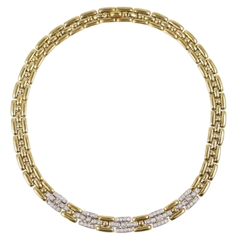 18k Railroad design gold necklace the front sections applied with 65 round full cut diamonds set in 18k white gold total weight 2.65 carats, 73.2 grams 18k gold